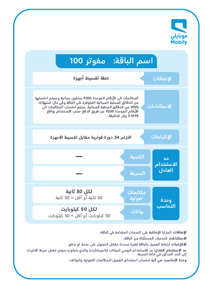 - العملاء ذوي الاحتياجات الخاصة من فئة الصم والبكم يمكنهم الحصول على خصم 50% على رسم الباقة الشهري بشكل دائم ويتطلب منهم إبراز مشهد وزارة الموارد البشرية والتنمية الاجتماعية من خلال فروع موبايلي لتوثيق طلبهم.