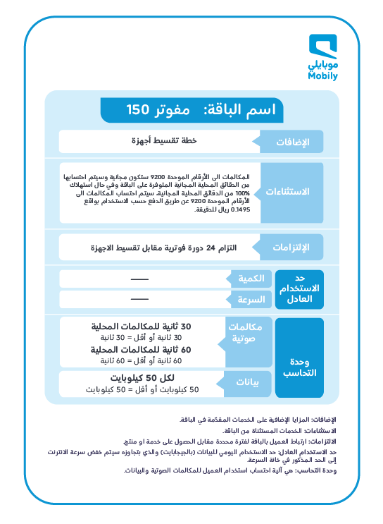 - المكالمات الى الأرقام الموحدة 9200 ستكون مجانية وسيتم احتسابها من الدقائق المحلية المجانية المتوفرة على الباقة وفي حال استهلاك 100% من الدقائق المحلية المجانية، سيتم احتساب المكالمات الى الأرقام الموحدة 9200 عن طريق الدفع حسب الاستخدام بواقع 0.1495 ريال للدقيقة.