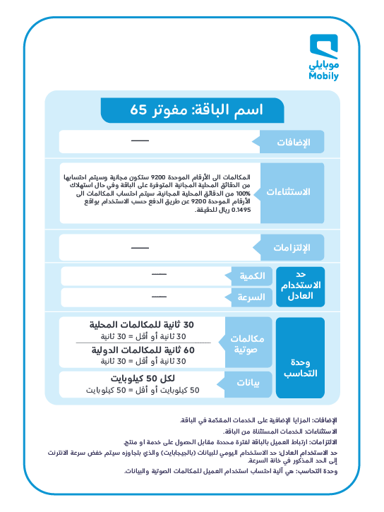 - المكالمات الى الأرقام الموحدة 9200 ستكون مجانية وسيتم احتسابها من الدقائق المحلية المجانية المتوفرة على الباقة وفي حال استهلاك 100% من الدقائق المحلية المجانية، سيتم احتساب المكالمات الى الأرقام الموحدة 9200 عن طريق الدفع حسب الاستخدام بواقع 0.1495 ريال للدقيقة.