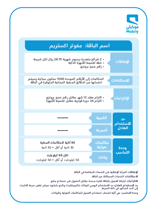 • رسوم التأسيس لمرة واحدة للباقات المفوترة هي 57.5 ريال سعودي.