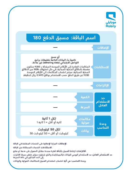 الباقات متاحة لشريحة موبايلي ولعملاء الباقات مسبقة الدفع.