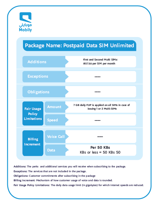 - 7 GB daily FUP is applied on all SIMs in case of issuing 1 or 2 Multi-SIMs