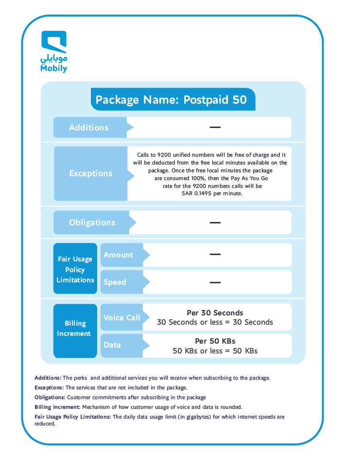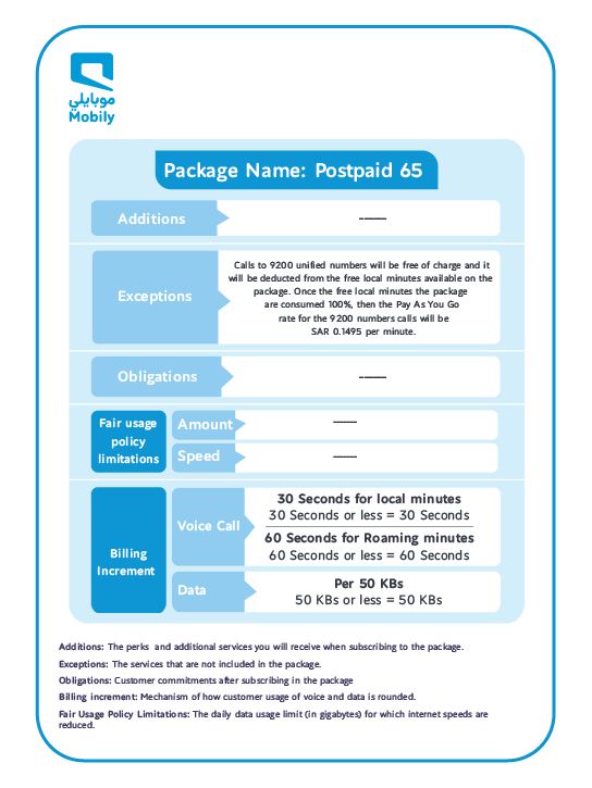 - The Setup Fees for new postpaid packages is SAR 57.5 onetime payment.
